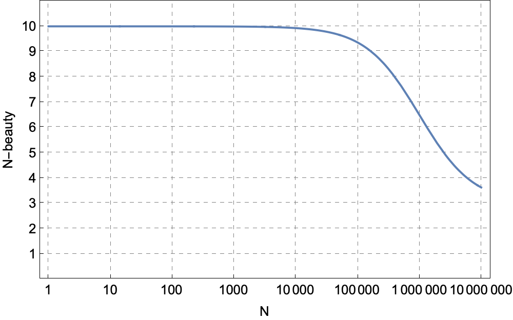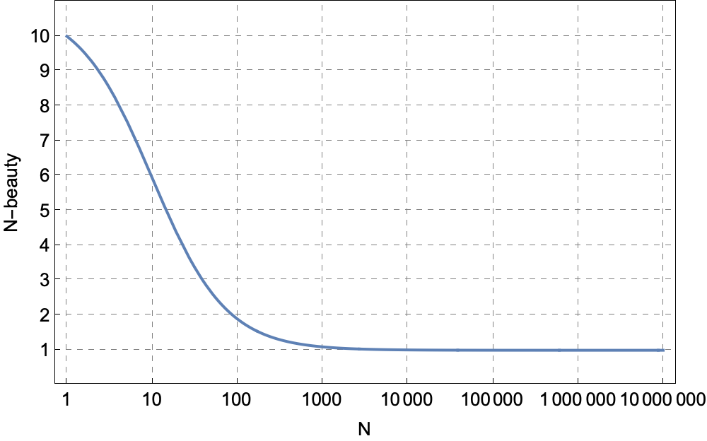Of course, I am not saying that a piece of art that is liked by few people is bad. Most pieces in the real world are simply not seen by many people, and even less so ranked, and so we cannot estimate N-beauty in practice usually. Even if the 1000-beauty of a piece is almost a perfect 10, it might be hard to find those 1000 people in practice. But the number still exists in principle.